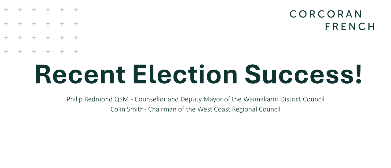 Corcoran French is delighted to congratulate two former partners on their recent election successes. Philip Redmond QSM has been elected Counsellor and appointed to serve as Deputy Mayor of the Waimakariri District Council for the next 18 months. Philip has…